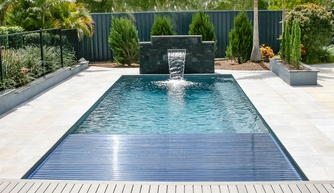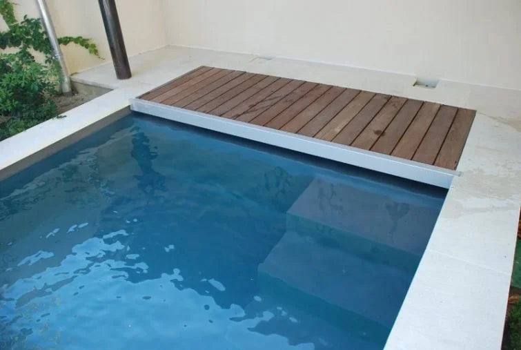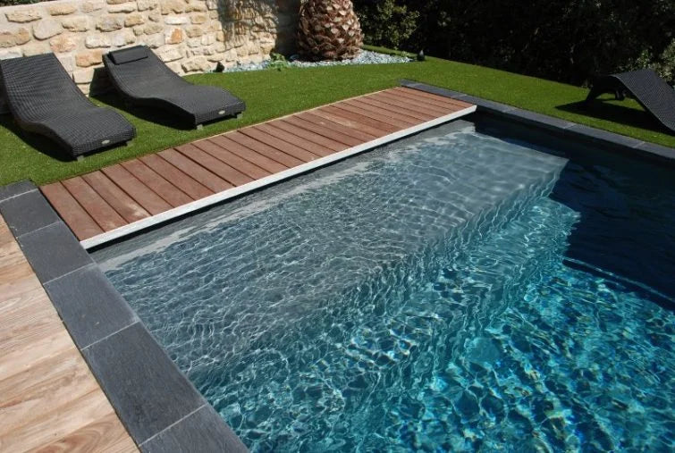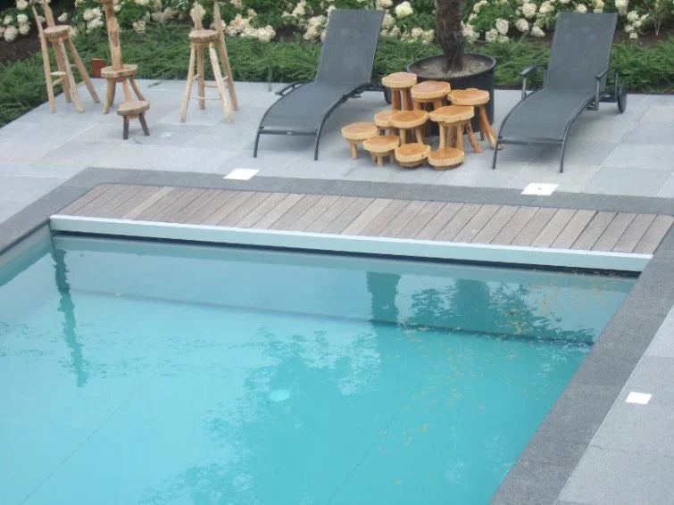 A modern and elegant slatted cover placed on the short side of the pool. The stainless steel support with wood finish gives it a modern look.