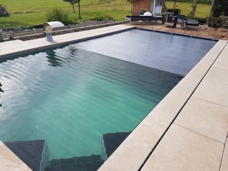 The above-ground device means that the slatted cover is rolled up on an external device mounted on the pool edge. The device is operated manually with a crank or automatically with a key or remote control.