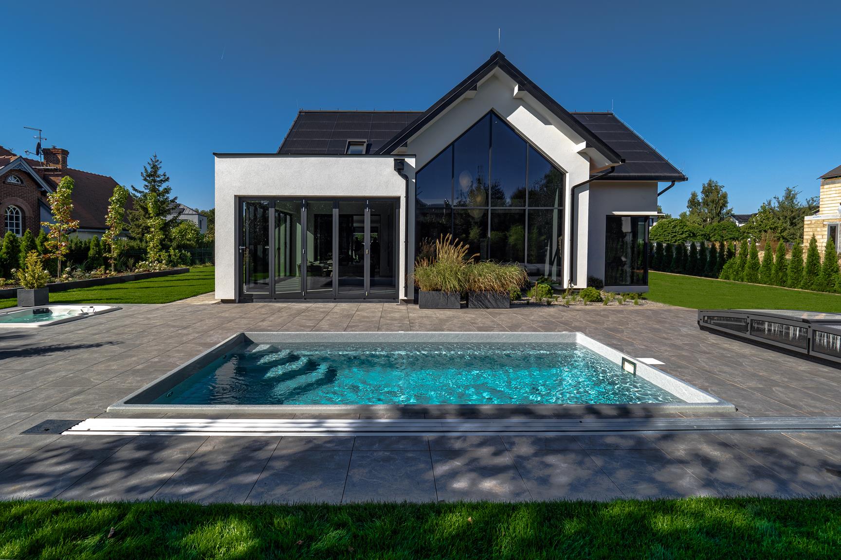 One of the smaller pools with the dimensions 6m x 3m x 1.45 in reinforced polyester. This pool, like all other pools, can be installed indoors as well as outdoors in gardens or on terraces. The model features a comfortable staircase on the left side of the pool's sidewall.