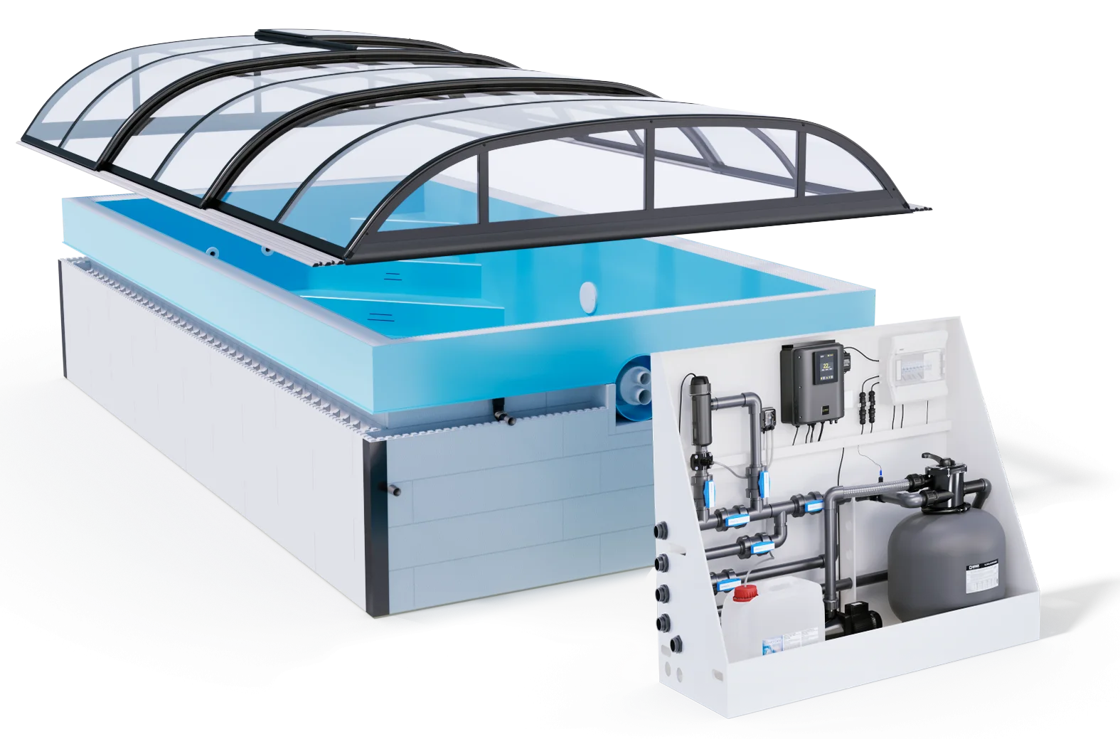 ThermoPP QBIG is a pool construction that combines the advantages of the thermopool design and the PP Pool's exclusive material to withstand high water temperatures without shortening the lifespan.