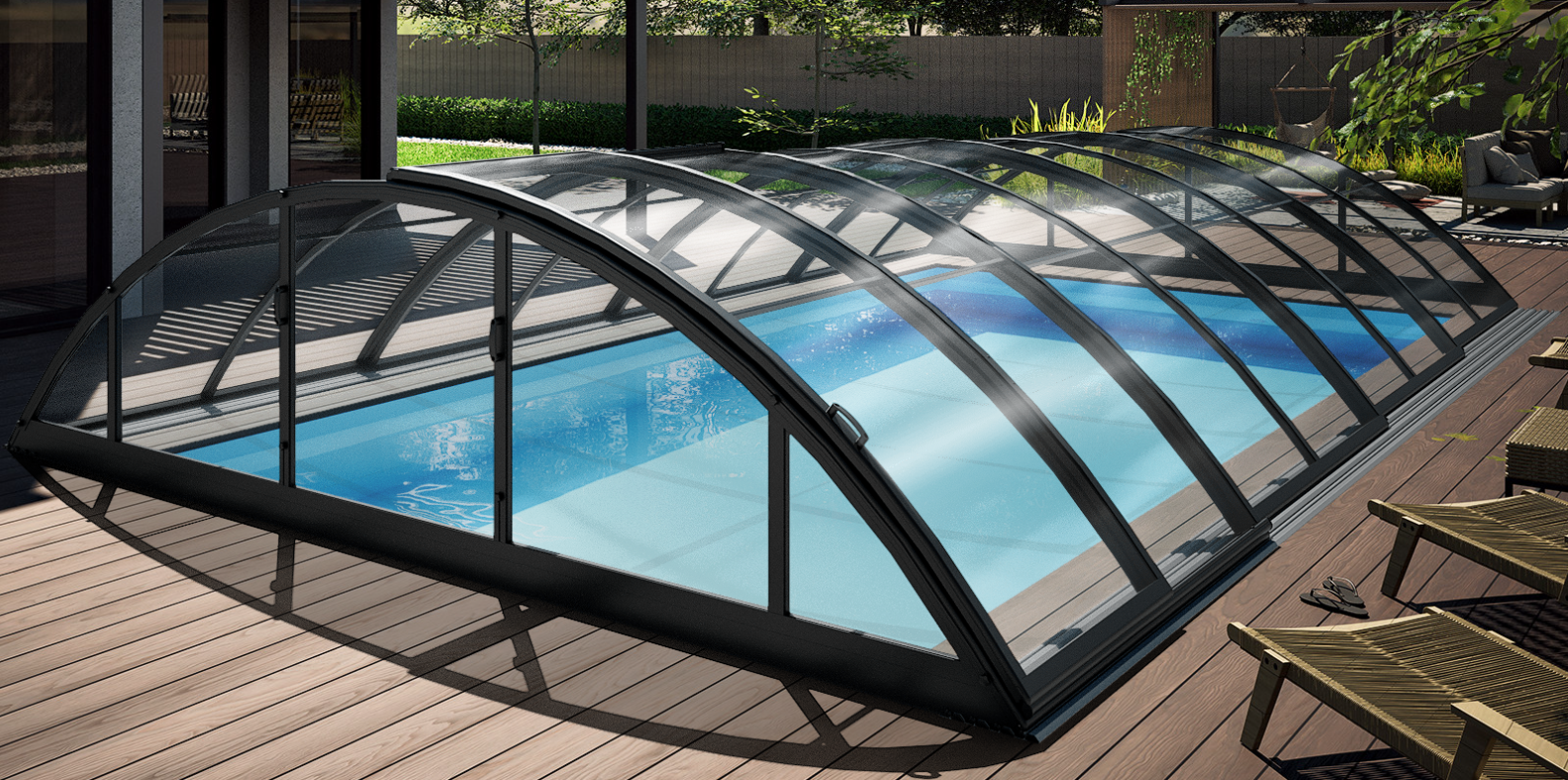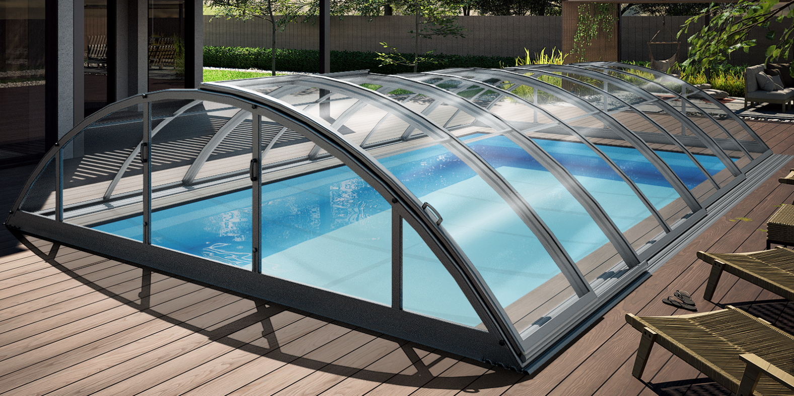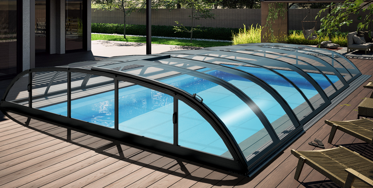 pool enclosure ICON offers a sophisticated, modern solution to effectively cover your pool. Its distinctive low profile, combined with elegant RAL71334 anthracite profiles, allows this pool...