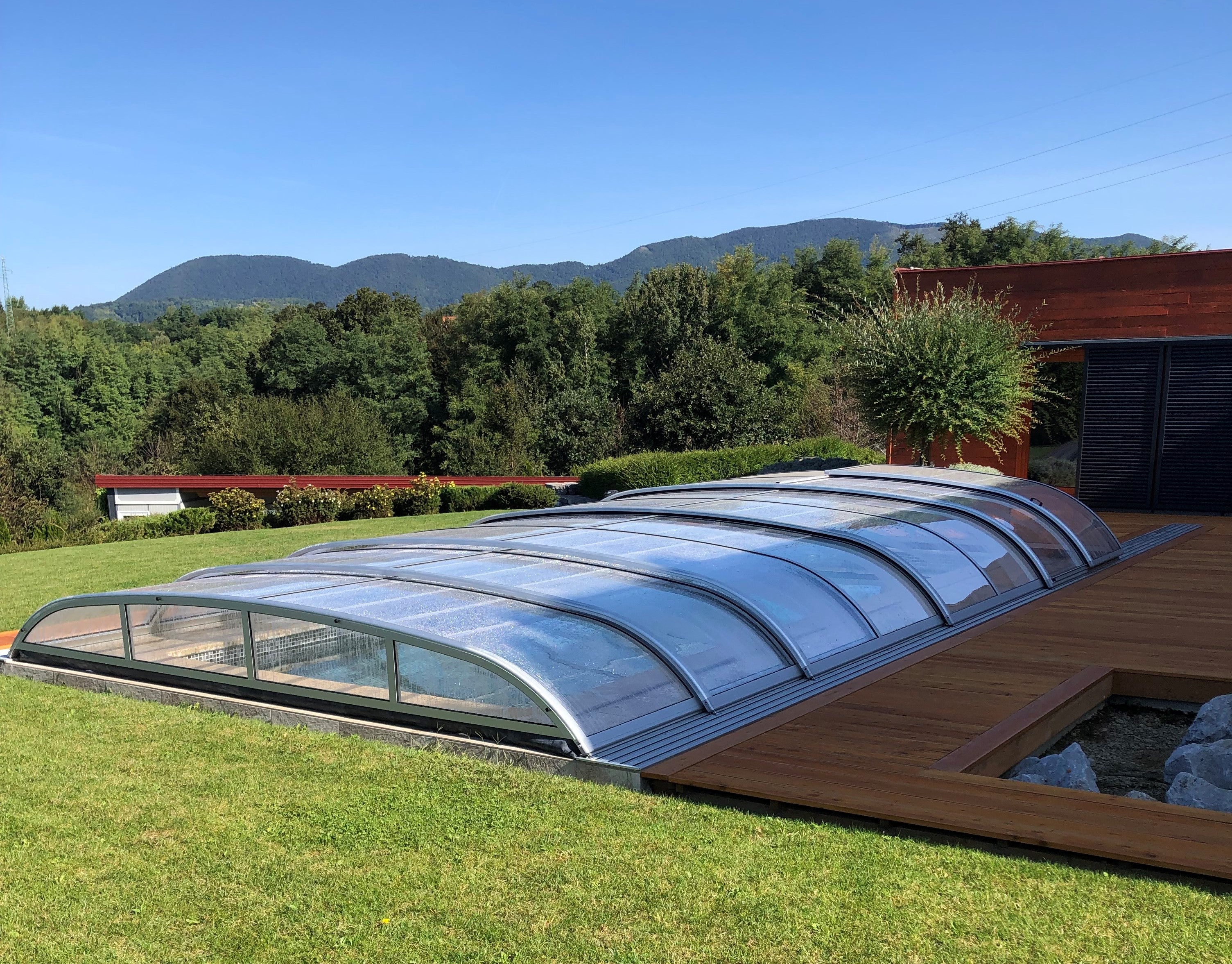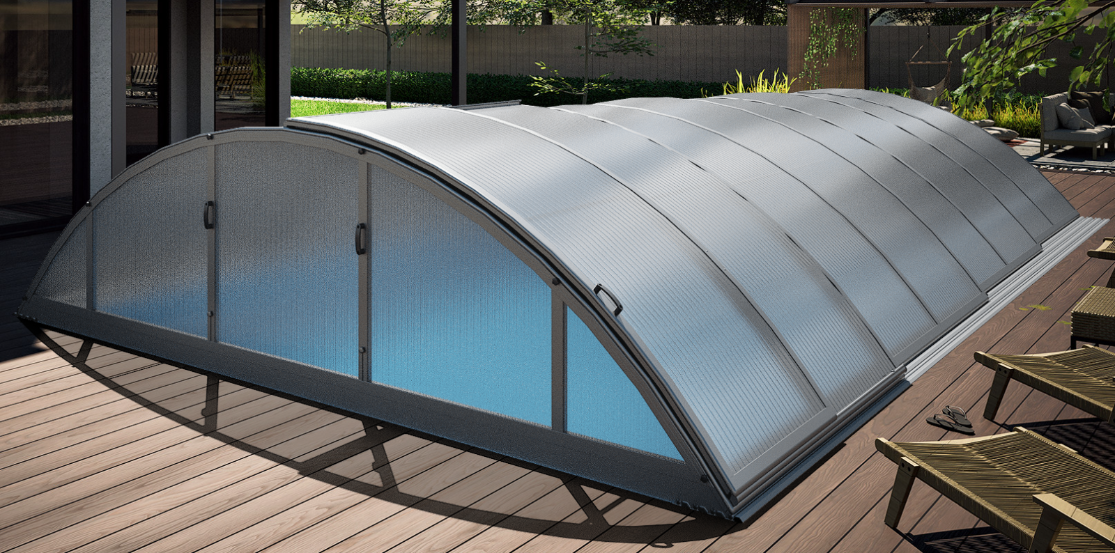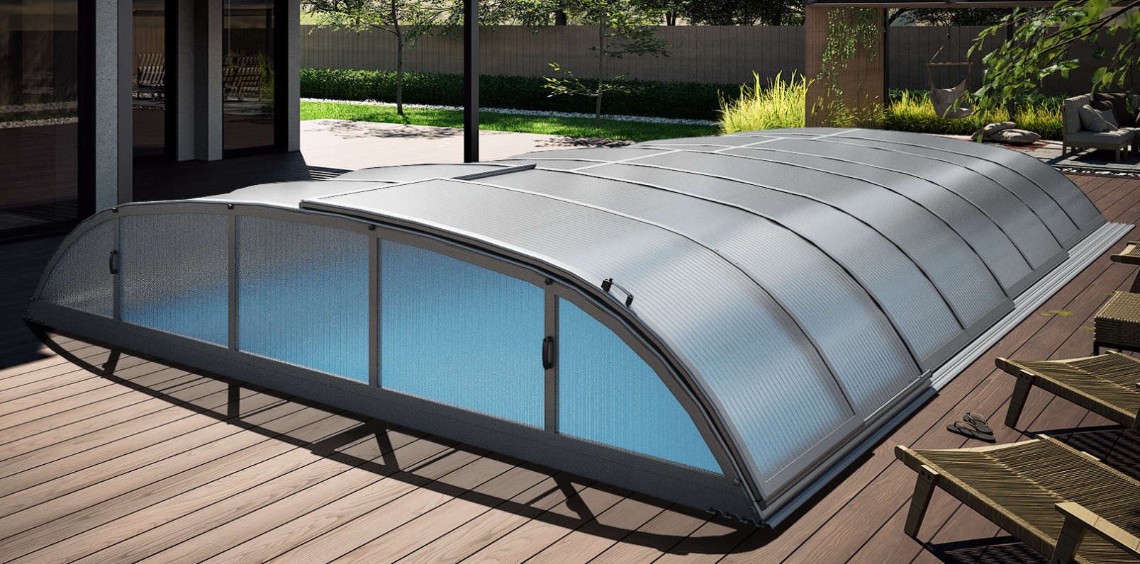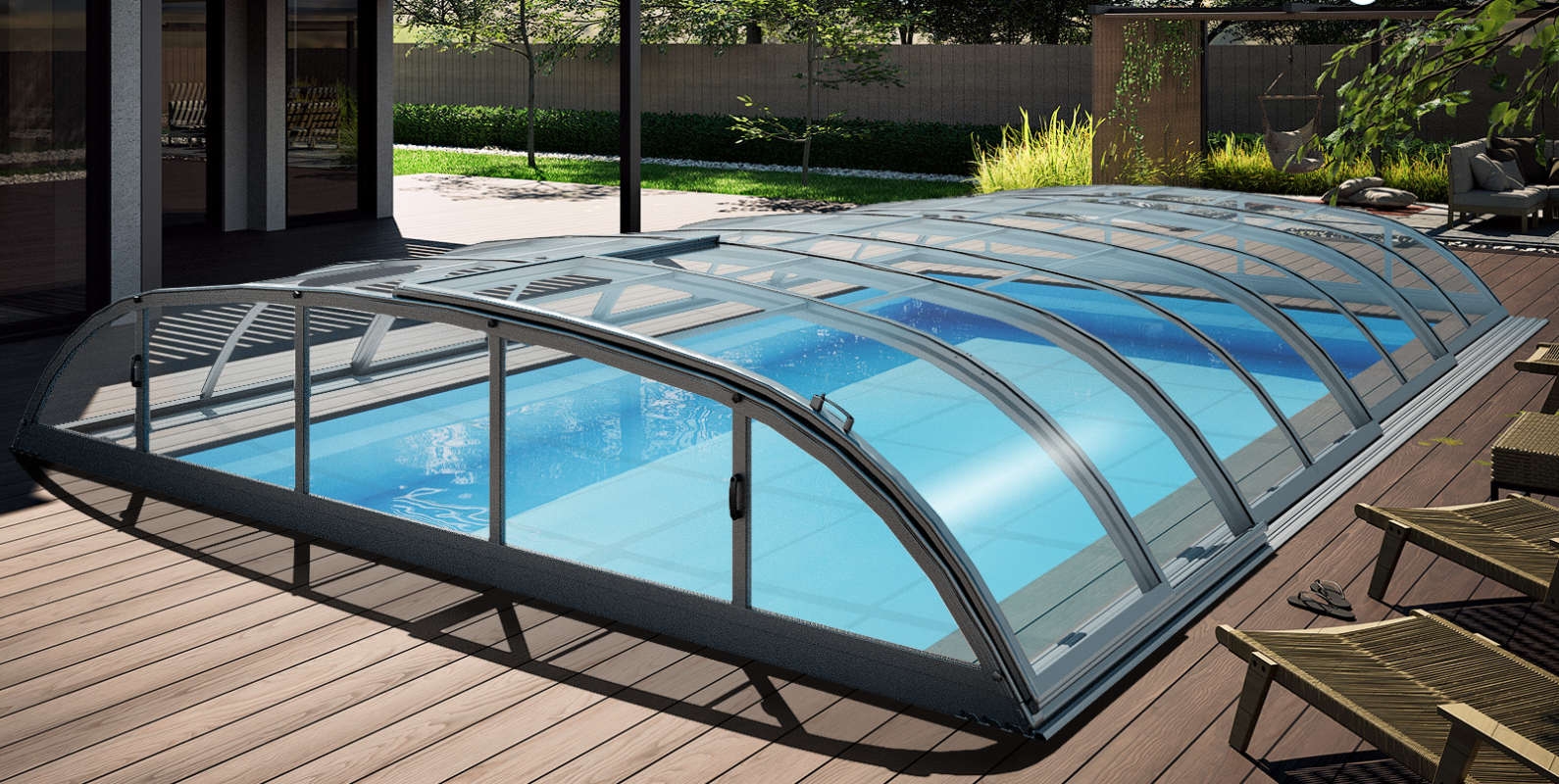 pool enclosure ICON offers a sophisticated, modern solution to effectively cover your pool. Its distinctive low profile, combined with elegant RAL71334 anthracite profiles, allows this pool...