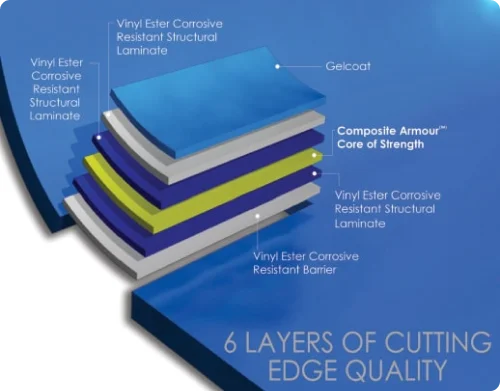During production, a mold is used where the gelcoat itself is sprayed on, giving the pool its color. Then a type of water barrier is applied in the form of vinylester or epoxy, followed by the application of a "core" that gives the pool its strength. The core can be made of composite, ceramic, kevlar, or basalt fiber mesh, and its purpose is to hold the pool together and protect it from cracks; and to provide its elasticity. Outside this core, a layer of polyester is then applied.