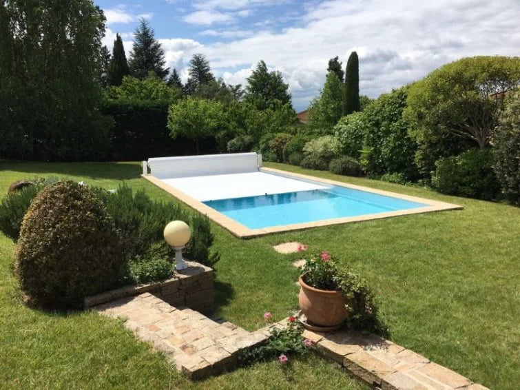 The above-ground device means that the slatted cover is rolled up on an external device mounted on the pool edge. The device is operated manually with a crank or automatically with a key or remote control.