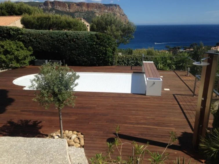 A modern and elegant slatted cover placed on the short side of the pool. The stainless steel support with wood finish gives it a modern look.