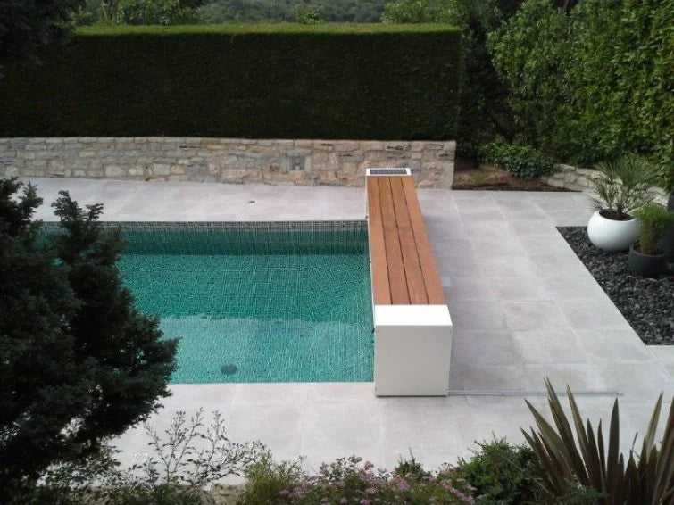 It gives you the advantage of being able to use the entire pool and is an ideal solution for a renovation. The bench can be covered with mosaic or tiles or vinylester in colors of your choice. -
