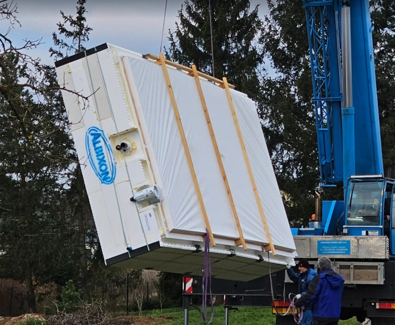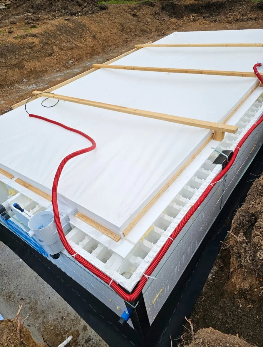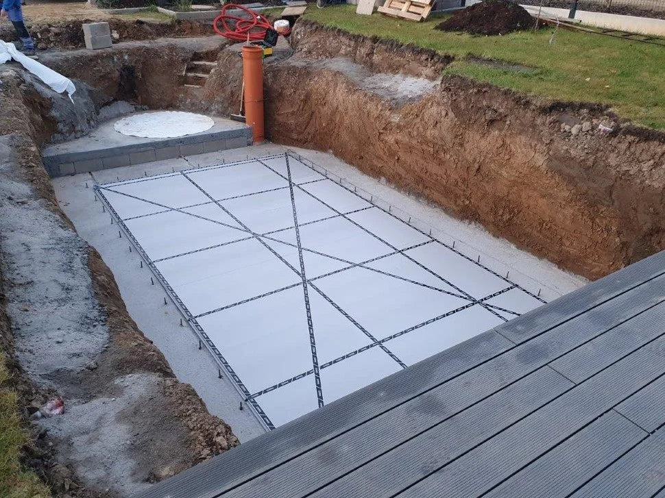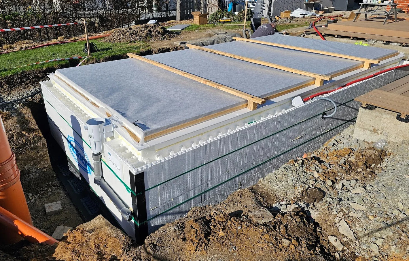 ThermoPP Pool is delivered as a complete tub and the installation is quick and easy. When installing the pool, you dig a hole where the pool will be placed, then lay down geotextile fabric, drainage, and base layer, and pour a slab. After this, the bottom insulation comes together with the pool, which you place down. As soon as the pool has been lowered into the hole, you can connect the pool, remove the protective film, and start filling the walls with reinforcement and liquid concrete. After about a week, you can start filling the inside with water and backfill around it with the soil you have dug up.