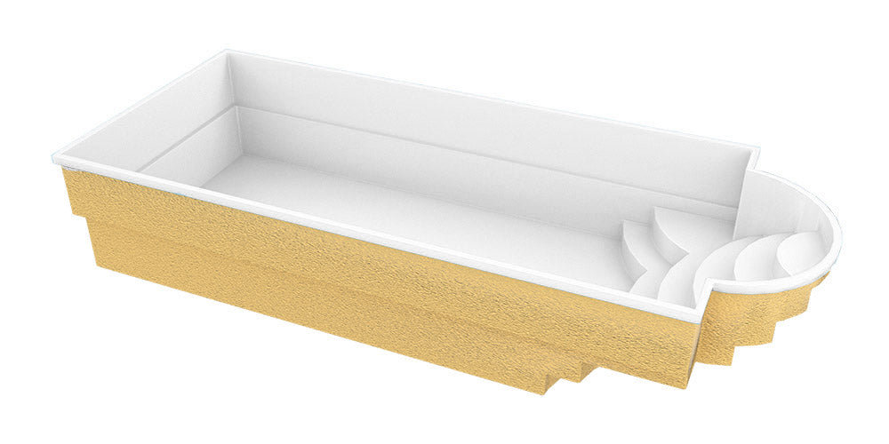 Pool with a length of 8m, width 3.20m, and a depth of 1.52m in reinforced polyester. A beautiful pool model with a rounded Roman staircase that also serves as seating. With an exotic wooden deck all around, it will look sophisticated in the garden.