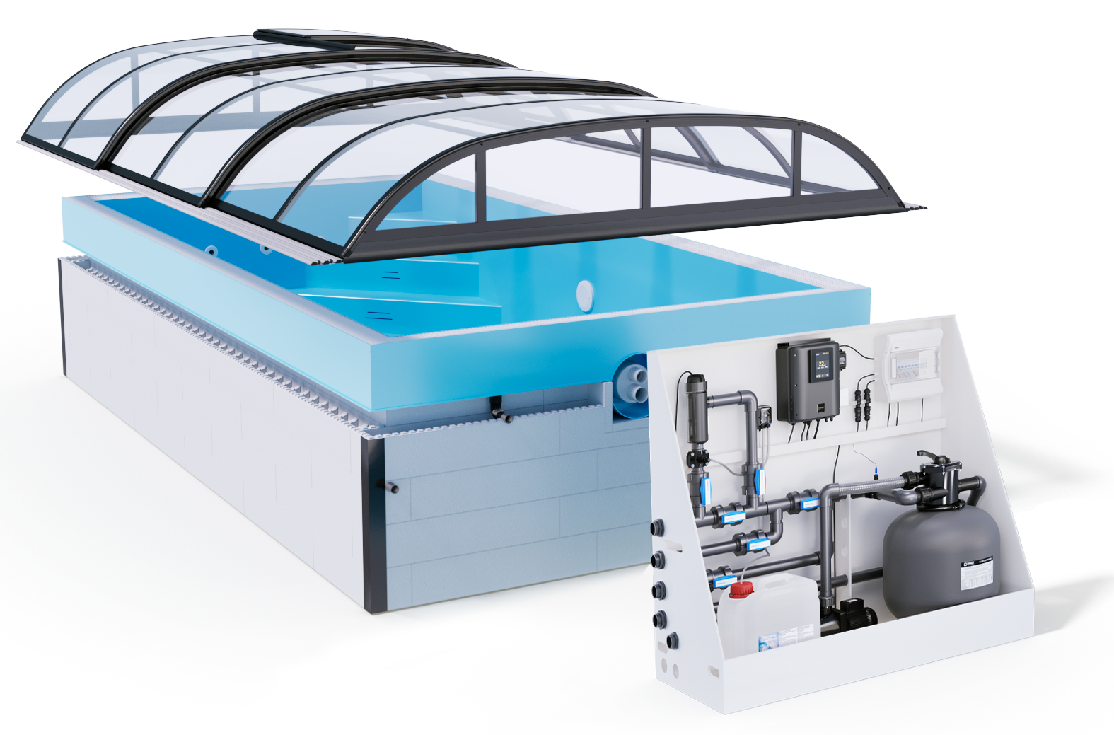 The pool is delivered as a "complete bathtub" where the overflow channel, inlet, lights, and pipes are already installed and the polystyrene blocks are already mounted on the pool. Place the pool on a cast slab, reinforce the pool and support the inner wall just like a thermal pool, then you can fill it with water while casting the walls. Fast installation and quality materials in one!