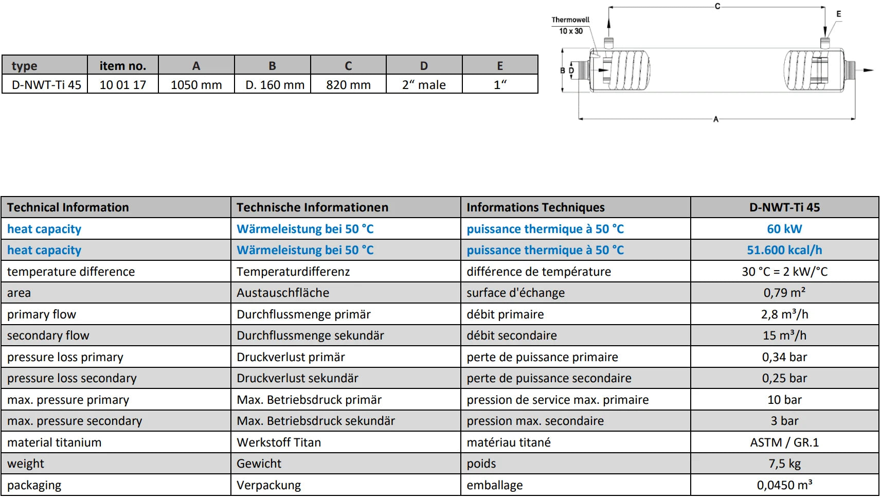 Water-to-water heat exchanger, crafted with traditional first-class workmanship and care, state-of-the-art welding. This premium heat exchanger offers uncompromising corrosion resistance, even at high salt concentrations in pool water, making it saltwater resistant. These heat exchangers provide maximum energy efficiency with minimal pressure loss. Like all tube heat exchangers, they must be integrated into the pool's water circuit either directly or via a bypass system.
